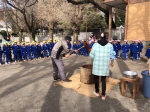 おもちつきのお歌を歌った後には、小さな臼におもちを分け、一人一人おもちつきを体験しました